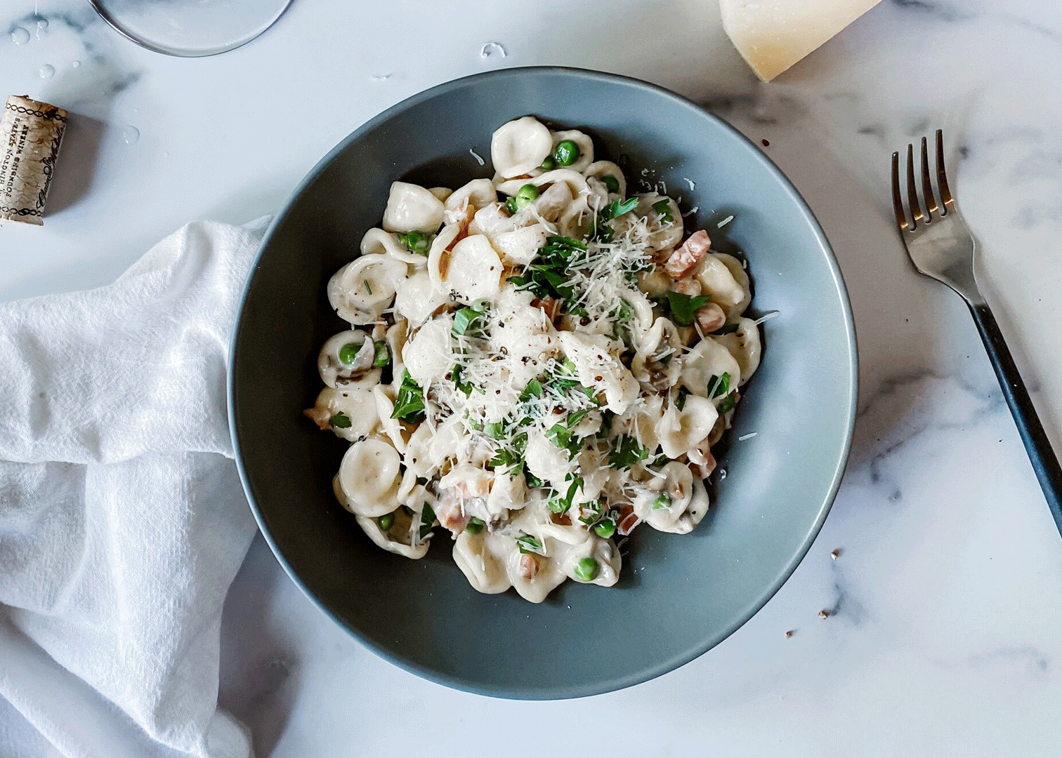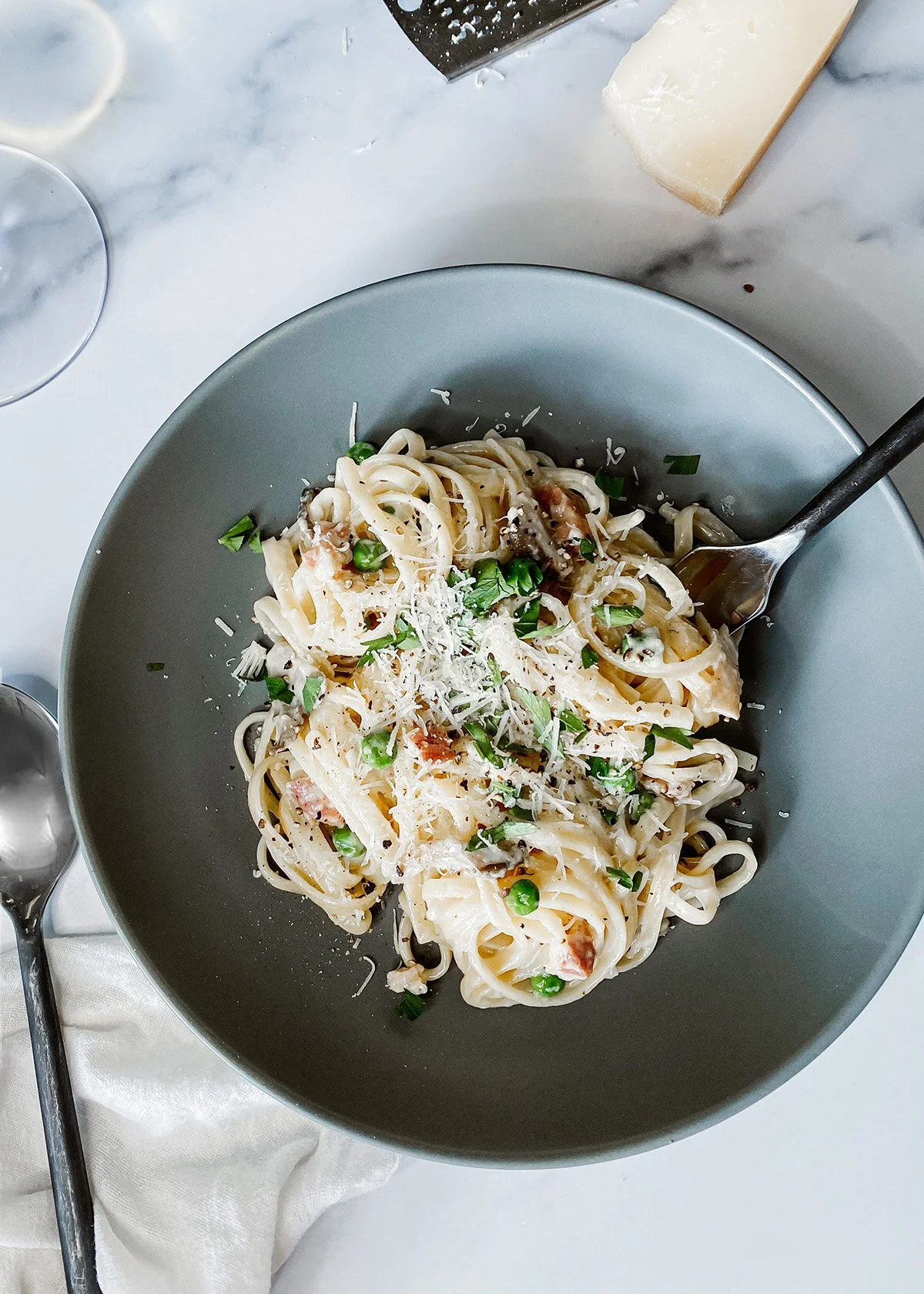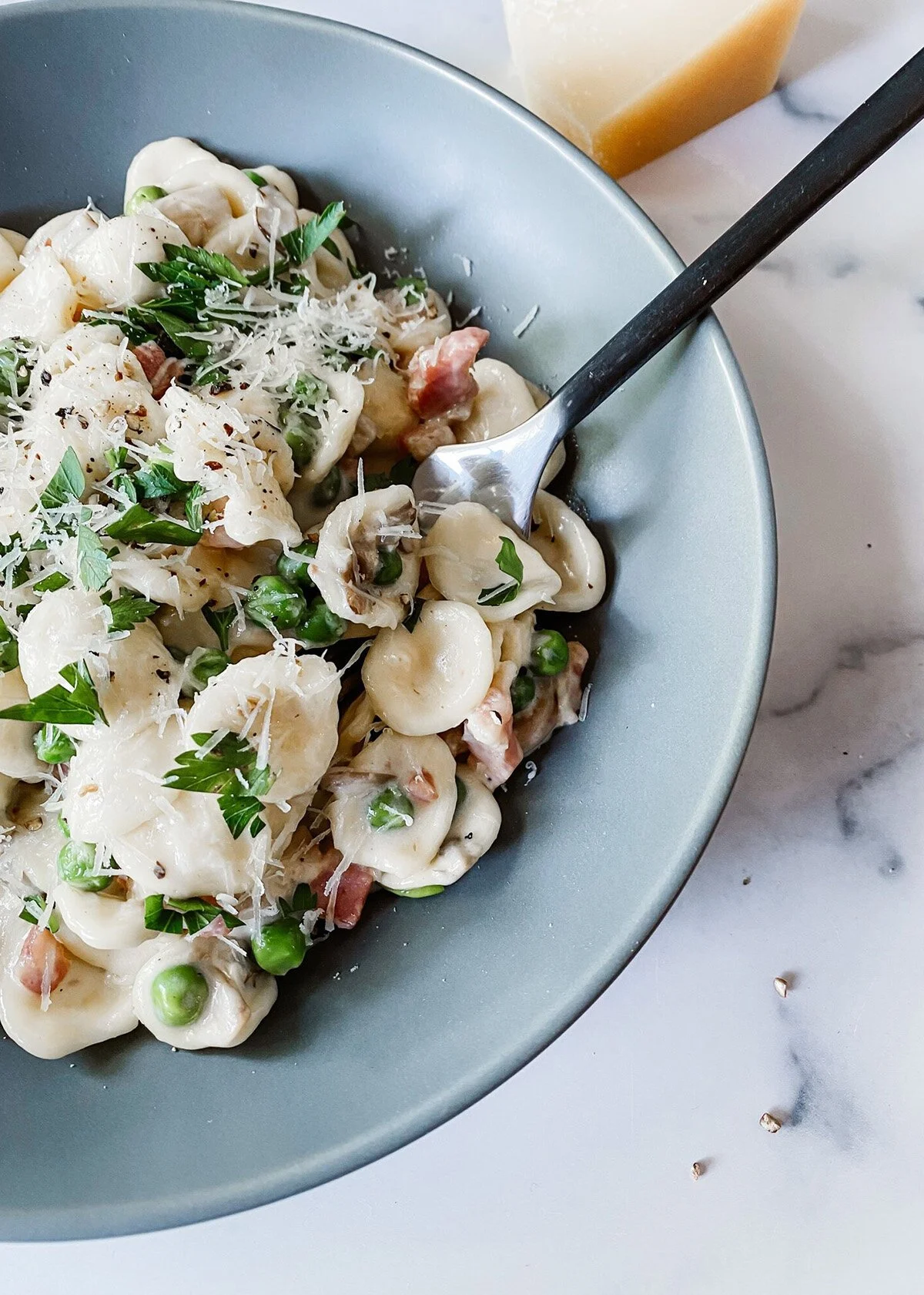 Creamy Garlic Pasta with Mushrooms, Bacon, & Peas
